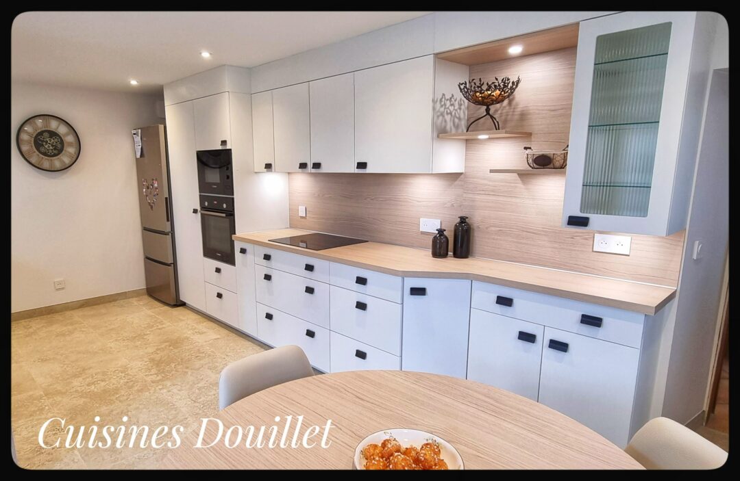 Une cuisine sur mesure tout en élégance. Cuisine blanche, en mélaminé structuré. Plan de travail stratifié, décor chêne naturel. Table ronde de diamètre 120 cm avec piètement en acier. Quatre chaises, tissu écru, piètement en fer. Four et table de cuisson Bosch, hotte aspirante Box totalement intégré Siemens. Lave vaisselle intégrable Neff. Mobilier de cuisine fabriqué en france. Une belle rénovation à la Frette, Isère en partenariat avec l’entreprise PEREM.